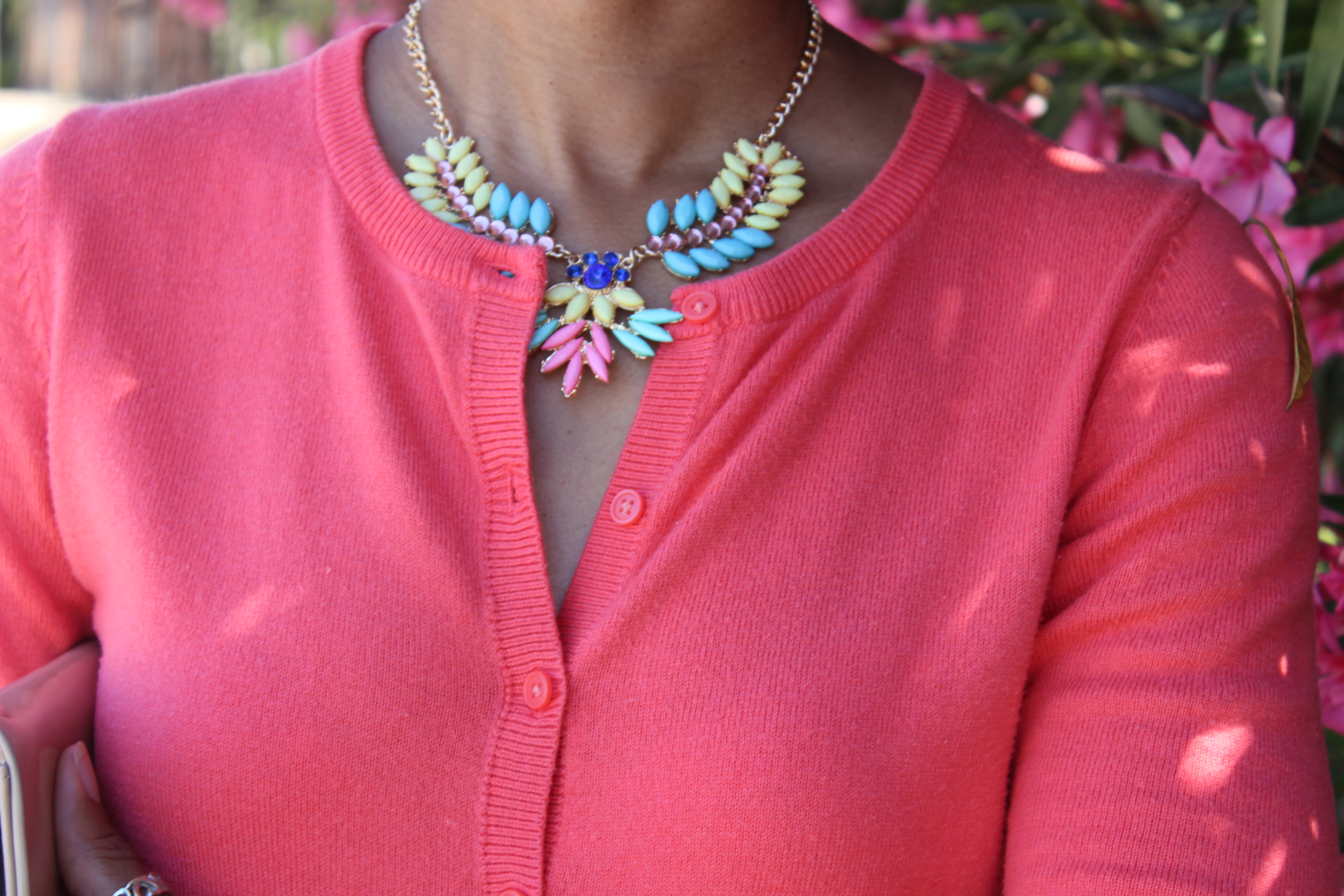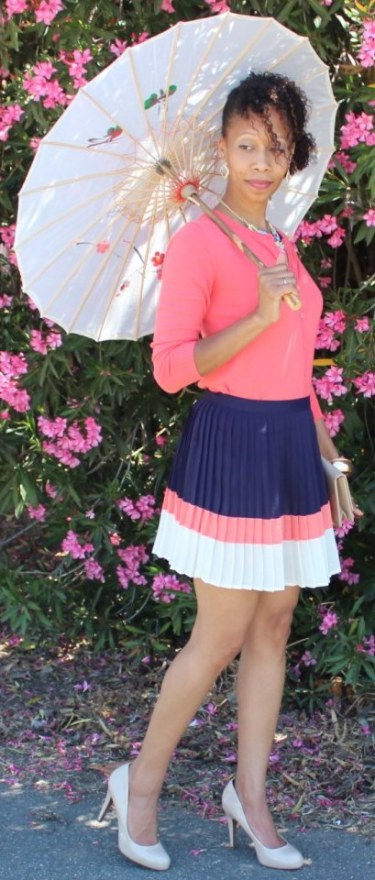 Another orange and blue ensemble?? Guilty as charged! You guys know about my love affair with orange and blue. This outfit is yet another example of that. I found this navy, coral, and cream pleated skirt for $10.50 and of course, I had to have it. I decided to pair it with a light-weight button up cardigan that I tucked in to create clean lines. For accessories, I’m wearing one of my favorite statement necklaces and a gold bracelet. A nude purse and shoes allow the other colors to shine while matching the cream hemline of the skirt. How do you style your pleated skirts?