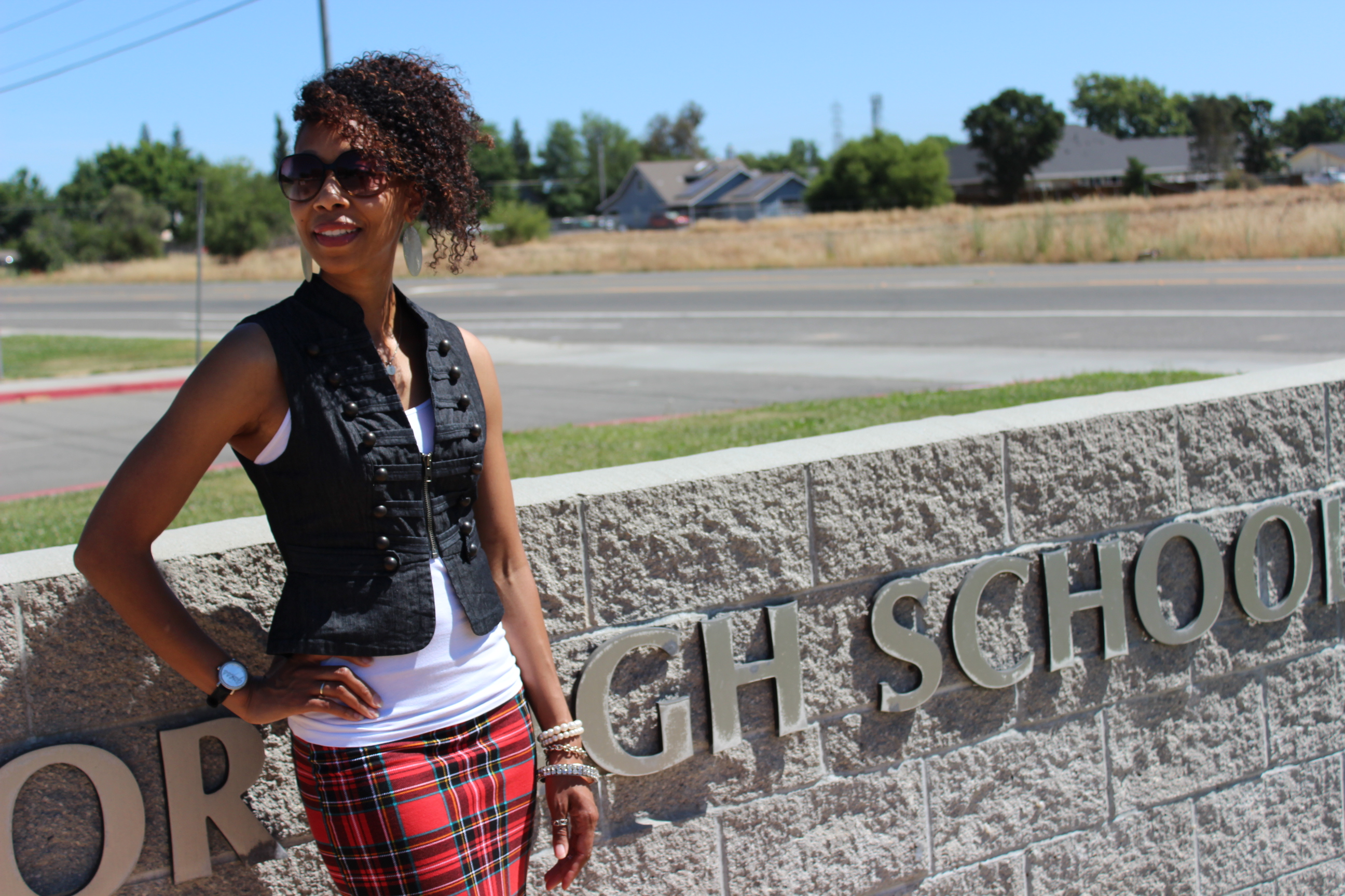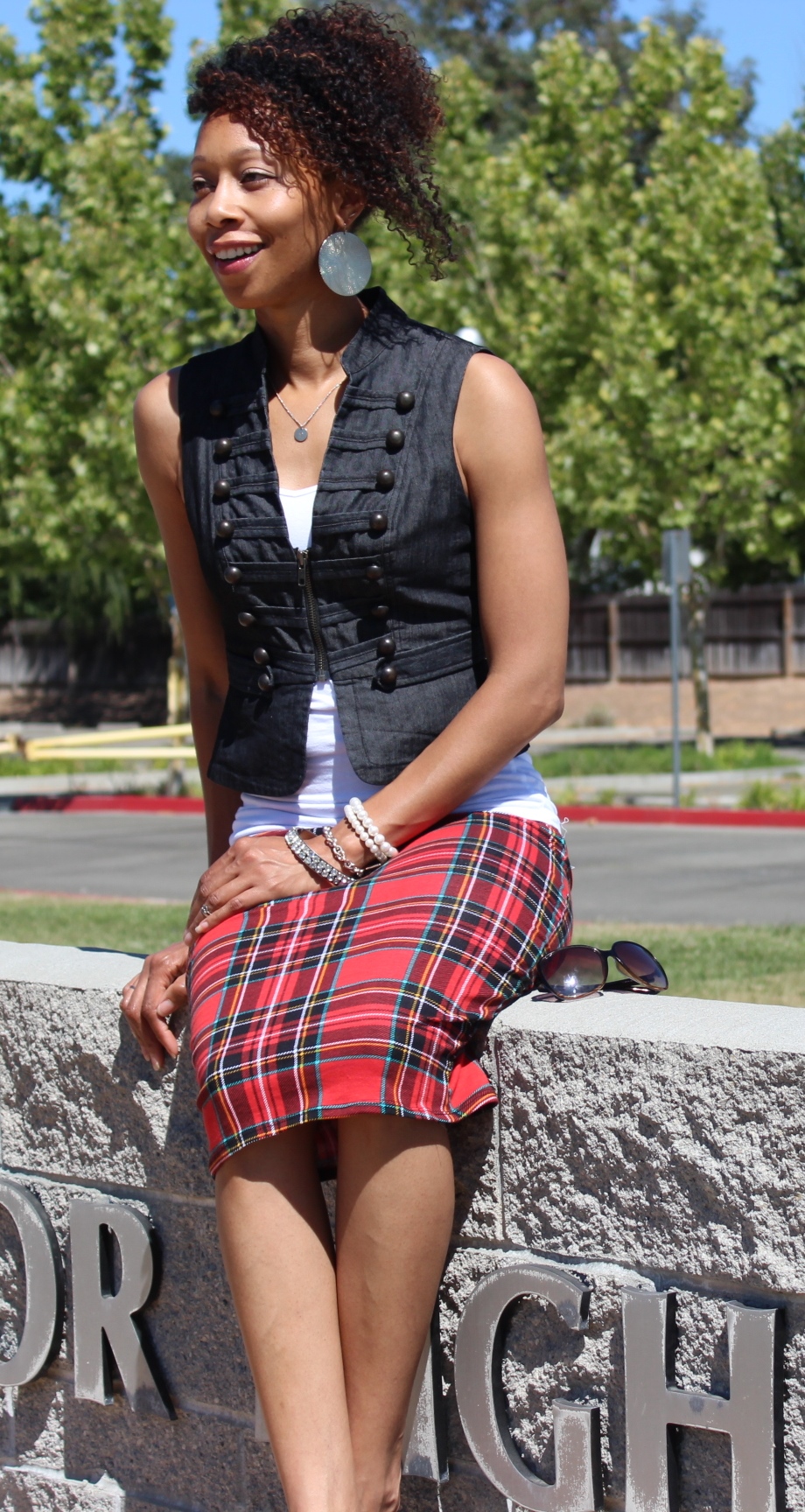 Pencil skirts can be such fun and feminine pieces. I scored this plaid pencil skirt for $7.99. Its classic pattern reminds me of my elementary school uniform. So to break up the school girl look, I added a little bad girl flare with this denim military vest. I chose a simple white tank top to wear under it to keep the outfit from looking too formal. (And because it was a 95° California day.) For arm candy I’m wearing June Cleaver pearls with a gaudy rhinestone bracelet and a black-banded watch. Simple black pumps finish the look. How will you rock your classic school girl pieces?