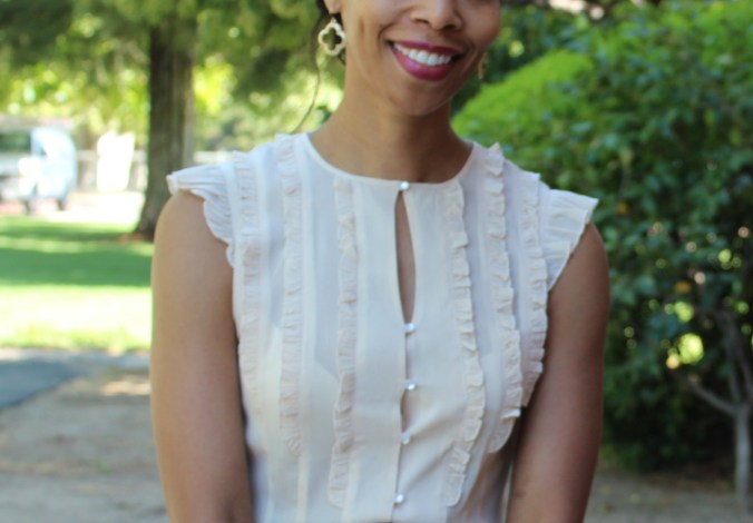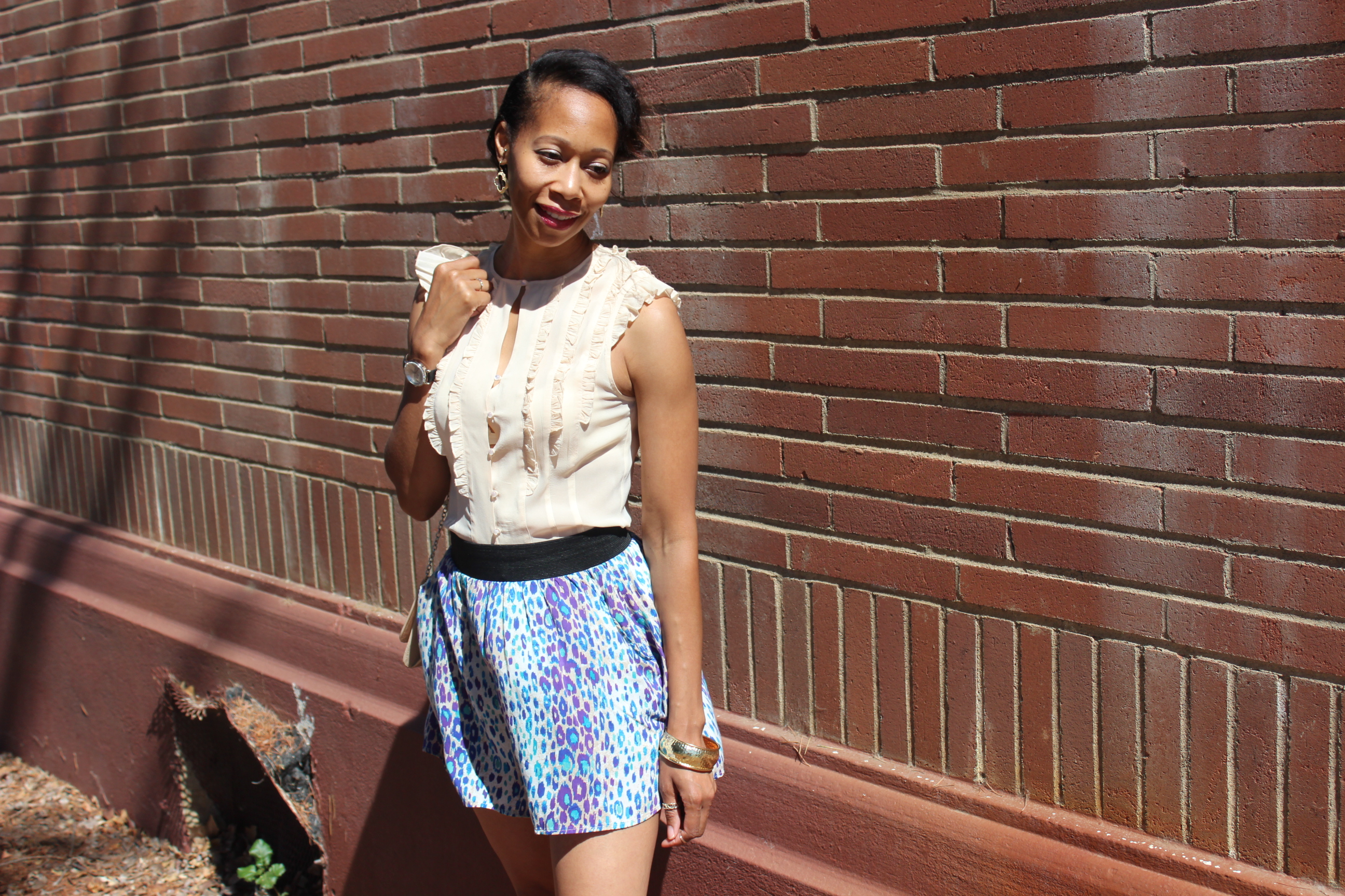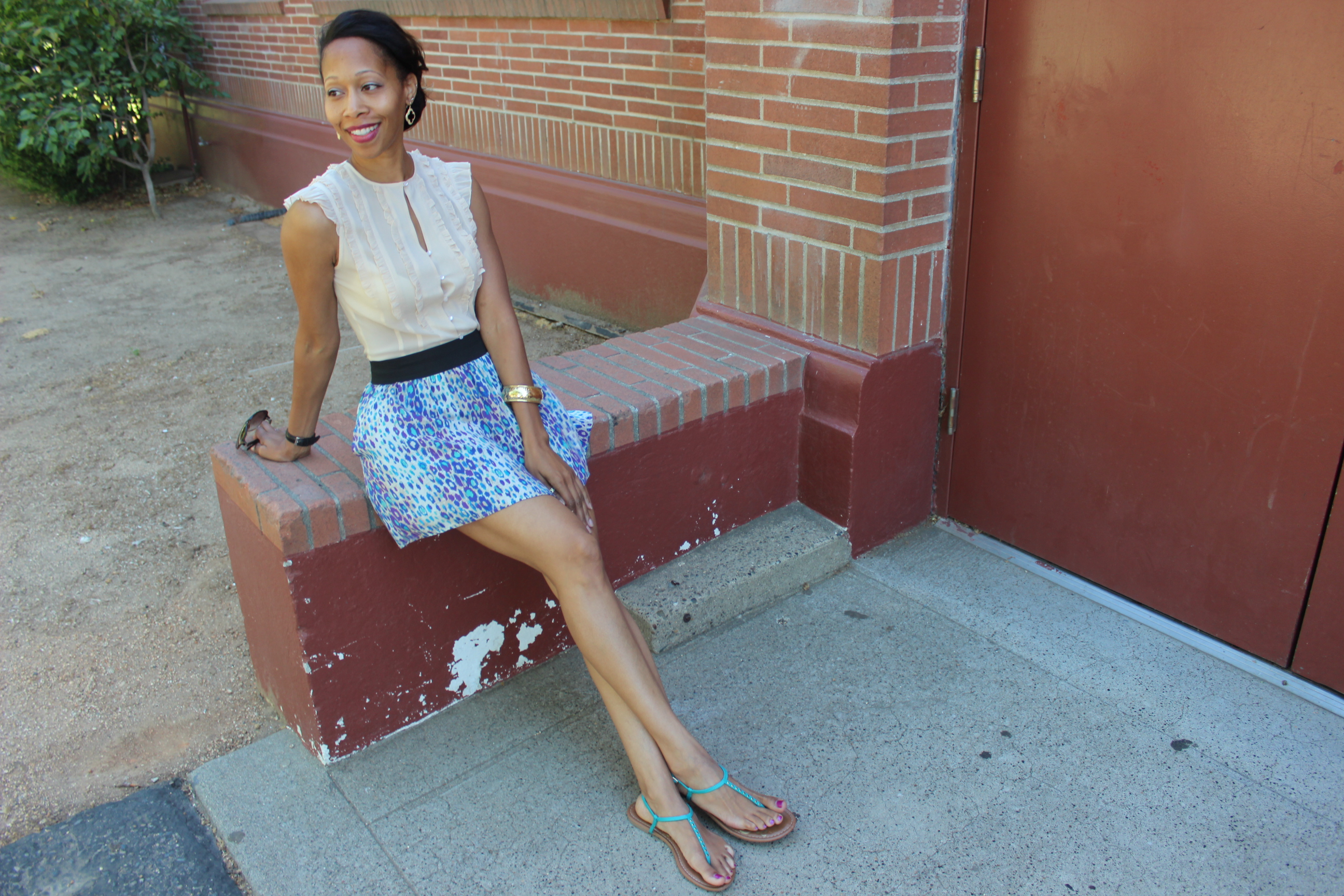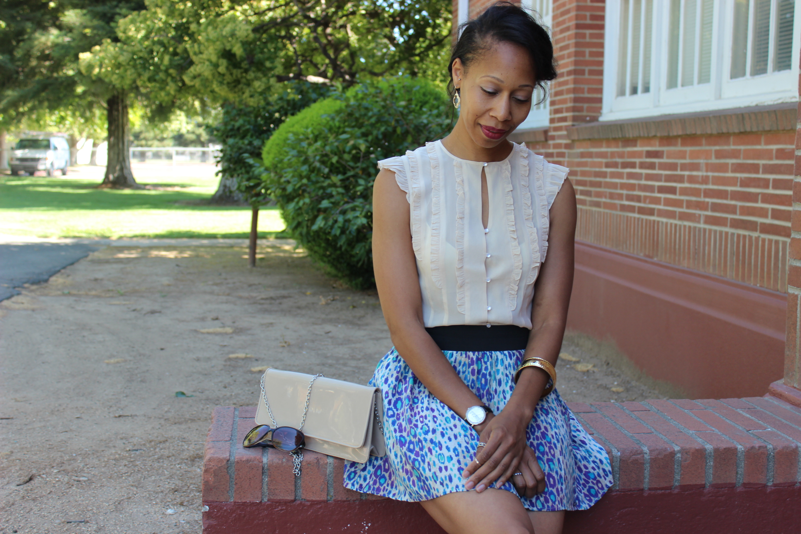 I purchased this nude flutter-sleeve blouse a few years ago and it has proven to be a true staple in my wardrobe. Today it is the perfect companion to this fun-seeking skater skirt. The skirt is not only on the lively side, it’s also on the shorter side. Which in my opinion can come off as slightly juvenile. The pale blouse does a fantastic job of combating this by adding just enough sophistication without competing with the colors of the skirt. Nude heels usually help to accomplish this as well. But on this hot and windy day, I’m simply wearing sandals. 🙂 What are some of your wardrobe staples?