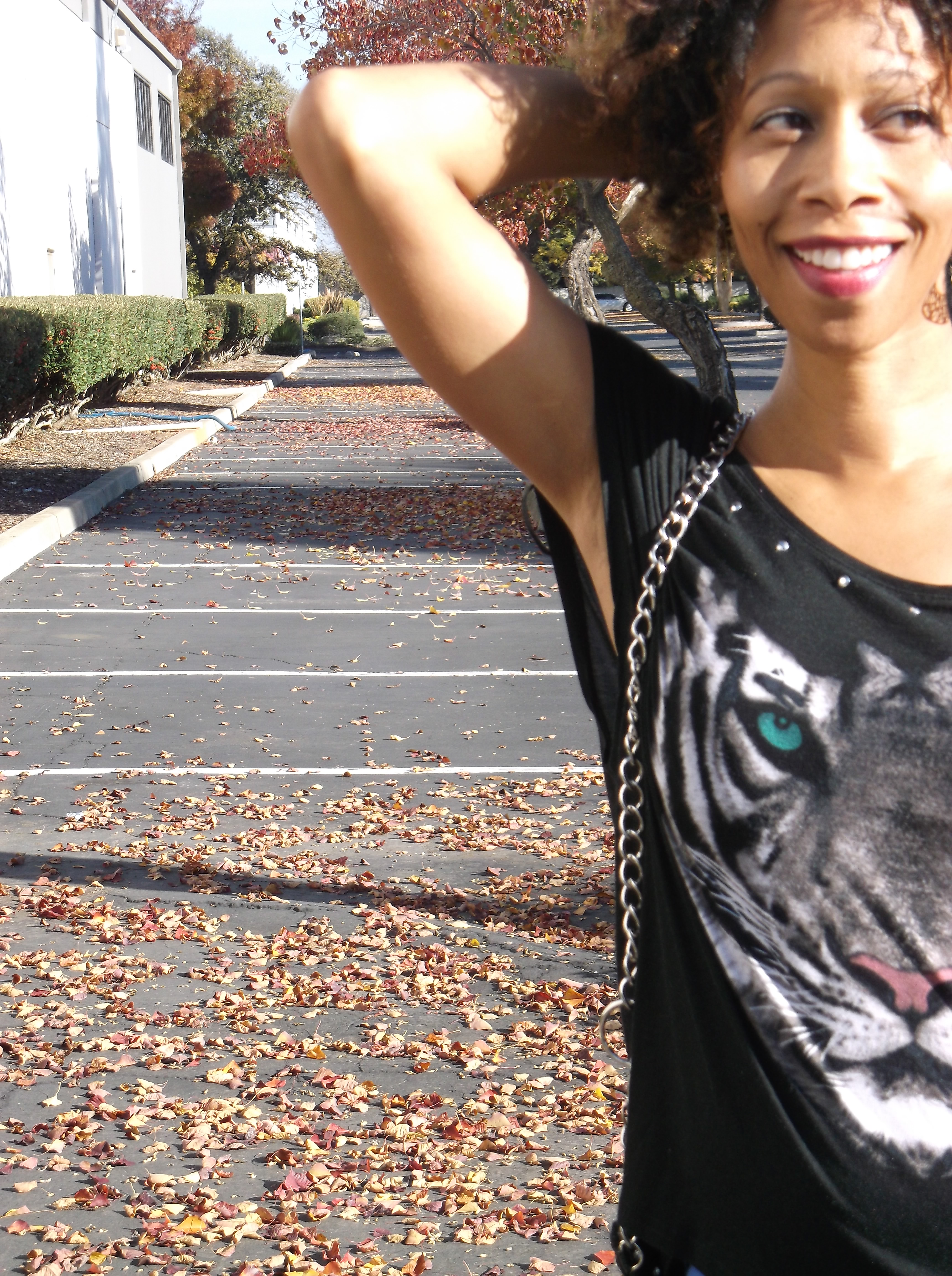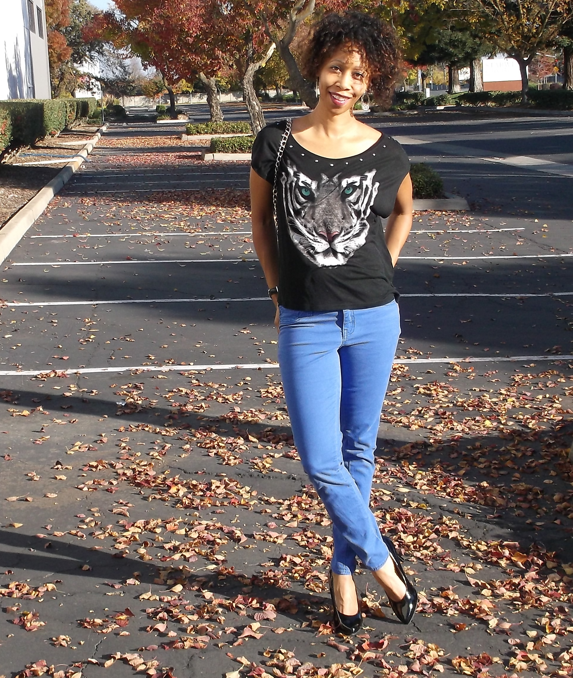There are so many benefits of colored pants. They’re perfect for color blocking, as a neutral, and to highlight an accent color. Which is how I’ve chosen to employ mine today. These periwinkle pants are the ideal color for styling my top.When I saw this tiger printed top it was love at first site. It is the epitome of versatility.  It’s loose fitting with wide armholes that don’t reveal too much.  The top’s stone studded neckline can be worn off the shoulder or centered for a lovely boat neck. The hi-low hemline has great movement that can be hidden away if the shirt is tucked in. But my favorite part about this top it the tiger’s piercing blue-green eyes. Their juxtaposition to the blue pants really makes pop. How do you style your colored pants?