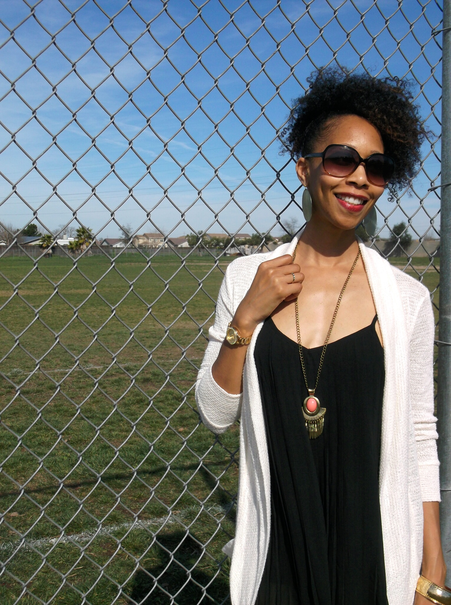 Since this spaghetti strapped, sheer, mini dress could almost be mistaken for lingerie, I toned it down with a basic knit cardigan. The long cardigan creates a perfectly even hemline with the LBD. Only showing a hint of the dress when viewed from behind.